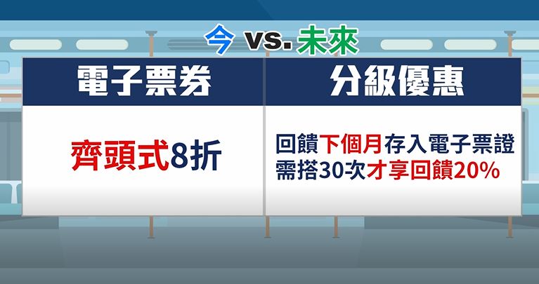未來將會,每個月結算搭車次數,下個月在把現金回饋,存回電子票證,可以用在任何消費上,但看看這分級,每個月必須搭到30次,而且轉乘公車 ,跟騎YouBike 不算在次數中,才享有原本就有回饋20%票價優惠。