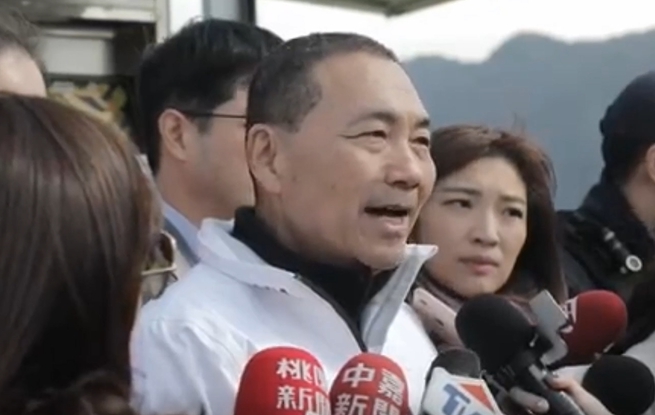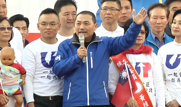 一字排開喊著韓國瑜凍蒜,國民黨好不容易湊齊,這大團結的場面,新北市長侯友宜卻被抓包好像喊得不夠賣力。