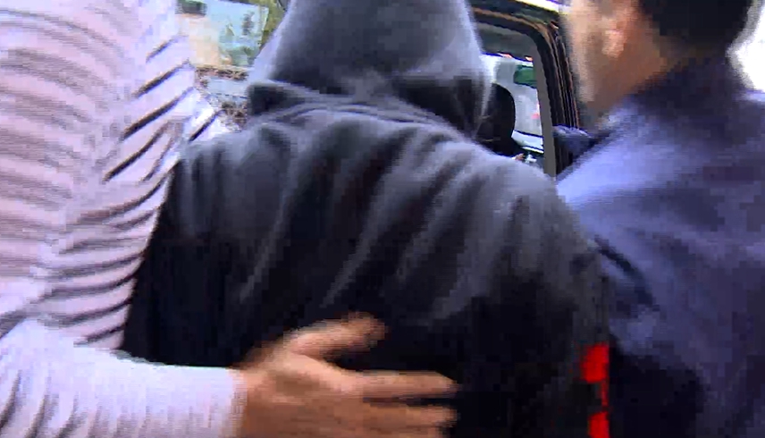穿帽踢外套,戴口罩,全身包緊緊,在兩名男同事一左一右陪同,快走離開北檢,他就是保六總隊陳姓女警,遭國民黨立委陳宜民拍落帽子、動粗推擠,北檢11日以證人身分傳喚他出庭,庭訊不到一小時,快閃離開。
