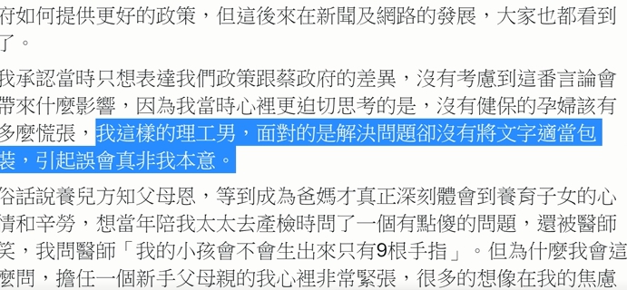 這插曲,主持人幽默化解,但選戰交鋒議題,要化解可沒這麼輕鬆,韓國瑜副手張善政稱總統蔡英文沒生過小孩,不知道父母的心挨轟,張善政收回,在臉書再解釋,我這樣的理工男,面對的是解決問題,卻沒有將文字適當包裝,引起誤會真非我本意。