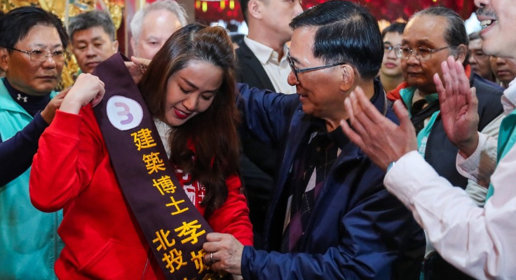 ▼前總統陳水扁北上為一邊一國行動黨台北市立委參選人李婉鈺助選,親自幫她披上競選背帶。(圖/中央社)