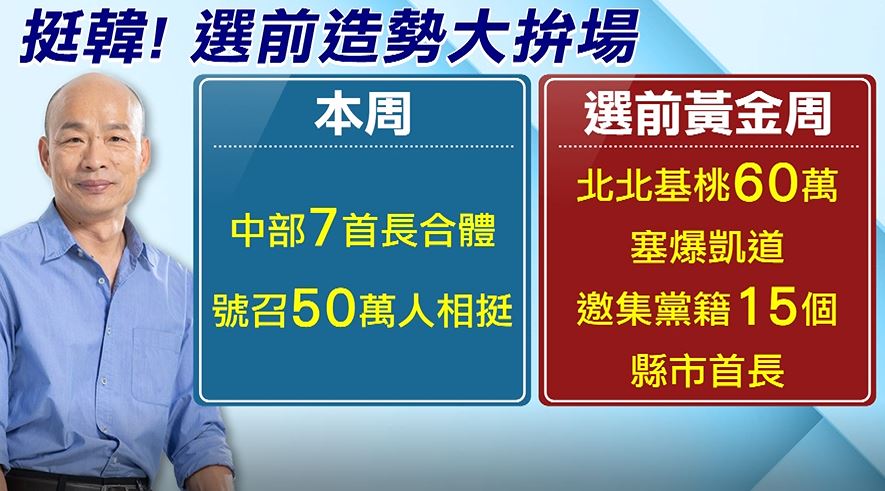不只國民黨青壯派,展現團結氣勢,上周六藍營挺韓造勢大成功,振奮基層士氣,打算趁勝追擊,將再本周規劃,把中部七縣市首長合體,號召至少五十萬人相挺,另外在選前的決勝黃金周,也要規劃,不只北北基桃60萬民眾塞爆凱道,還要加碼邀集黨籍15個縣市首長,團結力挺韓國瑜。
