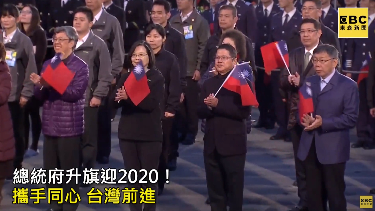 今天是2020年元旦,總統府一早舉行升旗典禮,今年主題為「攜手同心,台灣前進」,並邀請5名防疫英雄、15位棒球國手、40位扶輪社的交換學生一同領唱國歌,總統蔡英文、副總統陳建仁稍早於6點半左右到場,和台北市長柯文哲同框參加升旗典禮,不過雙方沒有太多互動,國民黨總統參選人韓國瑜的全國競總主委朱立倫也抵達總統府,率多名國民黨立委參加升旗。