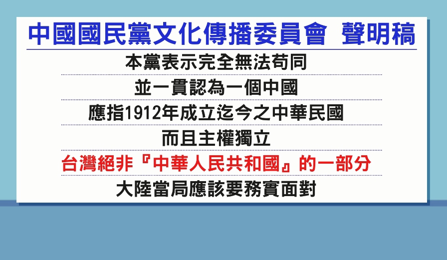 對於緬甸堅定奉行一個中國大陸政策,國民黨文化傳播委員會也發出聲明稿,表示完全無法認同,並認為一個中國大陸是指1912年成立到今天的中華民國,強調台灣絕不是中華人民共和國的一部分,要大陸當局務實面對。