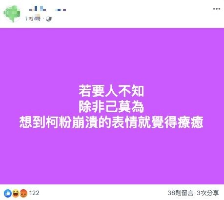 面對柯粉們的爆氣回應,這名網友也在臉書新發文表示:「若要人不知,除非己莫為。想到柯粉崩潰的表情就覺得療癒。」