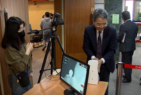 政院跟進架設紅外線熱像儀,不管是記者還是官員只要體溫超標,螢幕顯示紅色,就別想進入新聞中心。