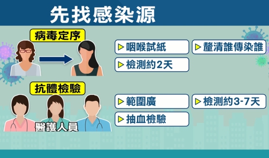 用血液抗體檢測跟過去病毒定序方式不一樣,病毒定序是以咽喉試紙,釐清誰傳染給誰,檢測大約2天,而抗體檢驗範圍更廣的是以抽血檢驗的方式,儘管需要3到7天,但至少能更全面的釐清,舉例而言,如果懷疑疫情已經進入社區傳播,那血液抗體檢測就能比較大範圍掌握,假設對一個地區內,一群民眾進行檢測,就能推算出百分之幾的民眾曾經染病,進而再去調查這些人的接觸史。