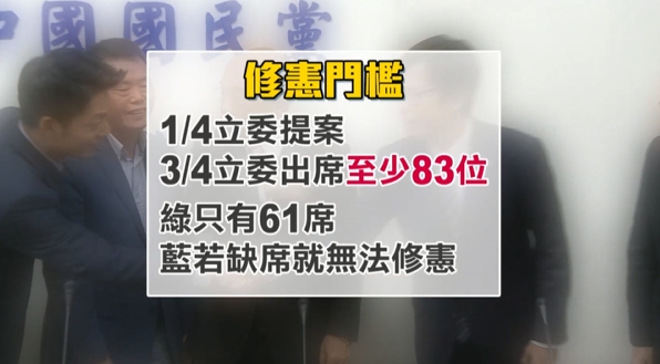 兩岸關係修正條例,目前在立法院已經一讀付委,但爭議最大的「憲法增修條文」則是更加敏感,因為修法除了要四分之一立委提案之外,更要四分之三立委出席,換句話說,至少要83位立委出席,才有機會闖關,但民進黨只有61席,等於一定要國民黨也加入才能夠完成修改。