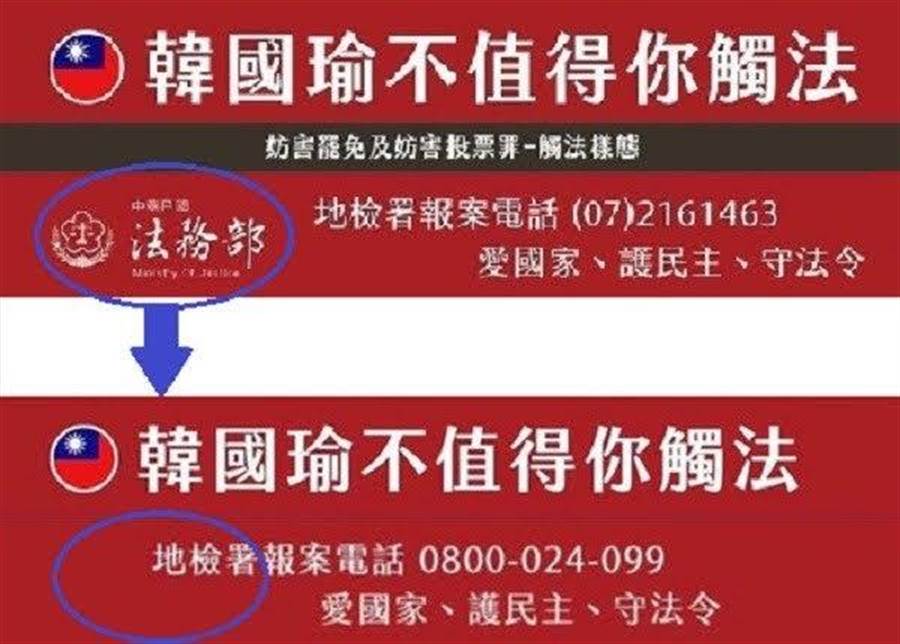 王育敏表示,罷韓團體冒用法務部logo製作公開文宣,顯有違法之虞,若該文宣被判定是「偽造、變造的公文書」,依刑法211條,可處1年以上7年以下有期徒刑。儘管高雄地檢署已接獲民眾告發,分案調查中,然而,法務部對自身logo遭冒用,第一時間不加以澄清,蔡清祥還在國會上說「能原諒的話就原諒,已經向作圖者表達立場,他們也已經改變,拿掉logo了」。