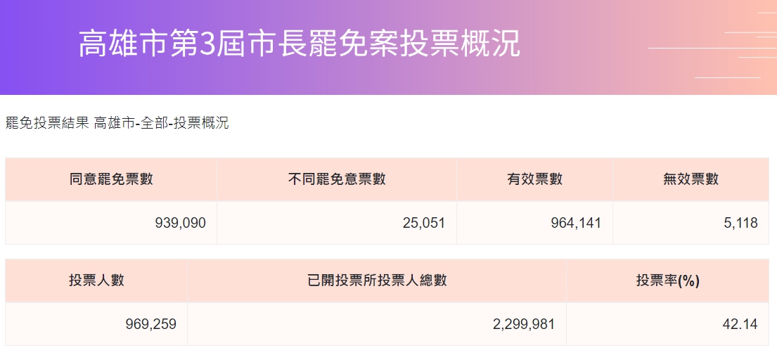 高雄市今(6)日舉辦罷免市長投票,開票結果出爐,同意罷免韓國瑜的票數為939,090票,不同意為25,051票,因此韓國瑜以40.8 %同意罷免票成為台灣第一位通過罷免門檻的直轄市市長,不過這不是韓國瑜第一次遭到罷免,他在1994年時任立法委員,卻因核四爭議加上忽略反核民意,遭到反核團體提起罷免,如今遭到第二次罷免,韓國瑜向支持者道歉,並感謝大家一路走來的互相扶持。