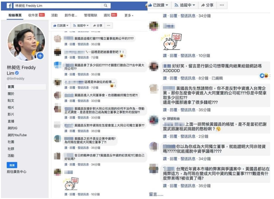 黃國昌的獨董爭議,「黃國昌之前不是反企業中資嗎?為何現在變成大同獨立董事了?!」「昔日的戰神去哪了?黃國昌反中資的初衷呢?打臉自己好玩嗎?」「你以為你成為大同獨立董事,就能證明大同非路資嗎?就能擺脫中資爭議嗎?」