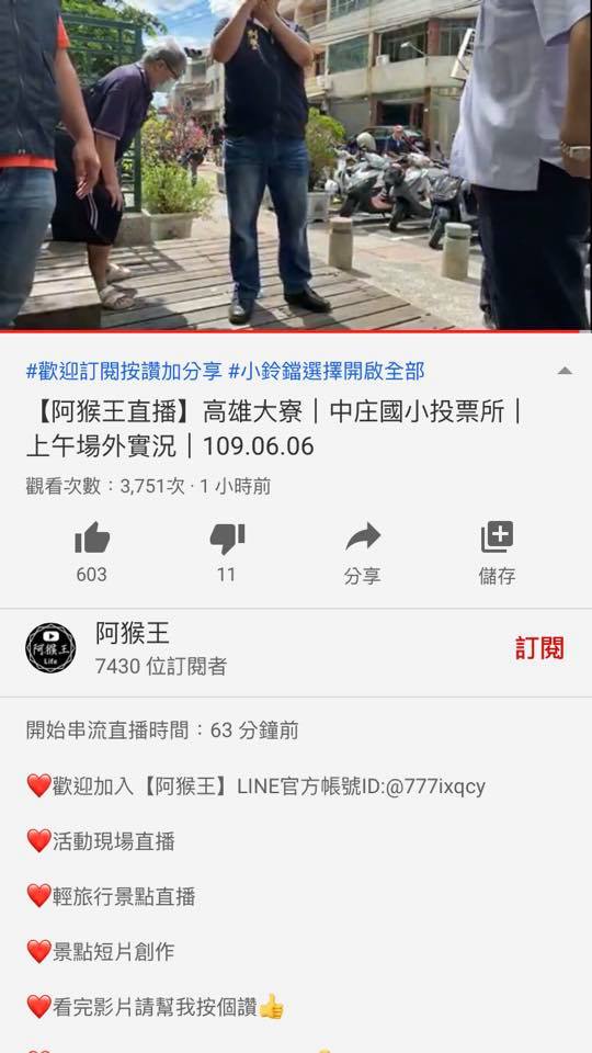 另外,也傳出有直播主在大寮區中庄國小前進行直播,被民眾檢舉通報有「監票」之嫌,警方獲報對其進行規勸,據悉,這名直播主的Youtube頻道內過去曾貼出多部挺韓影片。而該名直播主的直播截圖也在PTT瘋傳,掀起網友討論。