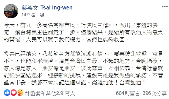 高雄市長韓國瑜罷免投票於今(6)日登場,稍早開票結果出爐,同意罷免韓國瑜的票數為93萬9090票,不同意為2萬5051票,韓國瑜以40.8 %同意罷免票遭到罷免,成為台灣第一位通過罷免門檻的直轄市市長。對此,總統蔡英文晚間在臉書發文。