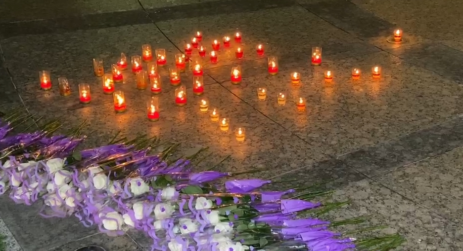▼許崑源住處樓下擺滿了蠟燭和花束為他哀悼。(圖/東森新聞)