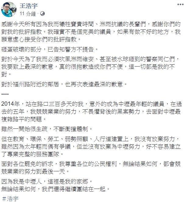 對於民眾在服務處砸雞蛋的舉動,王浩宇也正式做出回應,「感謝今天所有因為我而犧牲寶貴時間、淋雨抗議的長輩們,感謝你們的對我的批評指教。我確實不是個完美的議員,如果有做不好的地方,我願意虛心接受你們的批評指教。」並強調,「砸蛋破壞的部分,已告知警方不提告」,還向辛苦執勤的警方以及居民致歉,「對於今天為了我而必須吹風淋雨維安、甚至被水球砸到的警察同仁們,我要致上最深的歉意,真的很抱歉造成你們不便,這一切都是我的不對。對於福州路附近的鄰居,也再次表達最深的歉意。」
