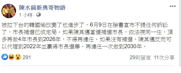陳水扁今晚在臉書PO文說,韓國瑜今天在臉書宣布不提任何訴訟了,市長補選已成定局。如果陳其邁當選補選市長,依法視同一任,頂多再做4年市長到2026年,不得再連任。如果沒有補選,陳其邁反而可以代理到2022年並贏得市長選舉,再連任一次做到2030年。