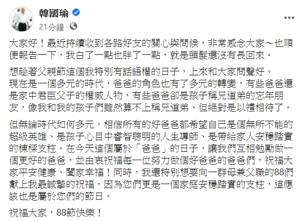 韓國瑜今日上午在臉書發文,「大家好!最近持續收到各路好友的關心與問候,非常感念大家~也順便報告一下,我白了一點也胖了一點,就是頭髮還沒有長回來。」