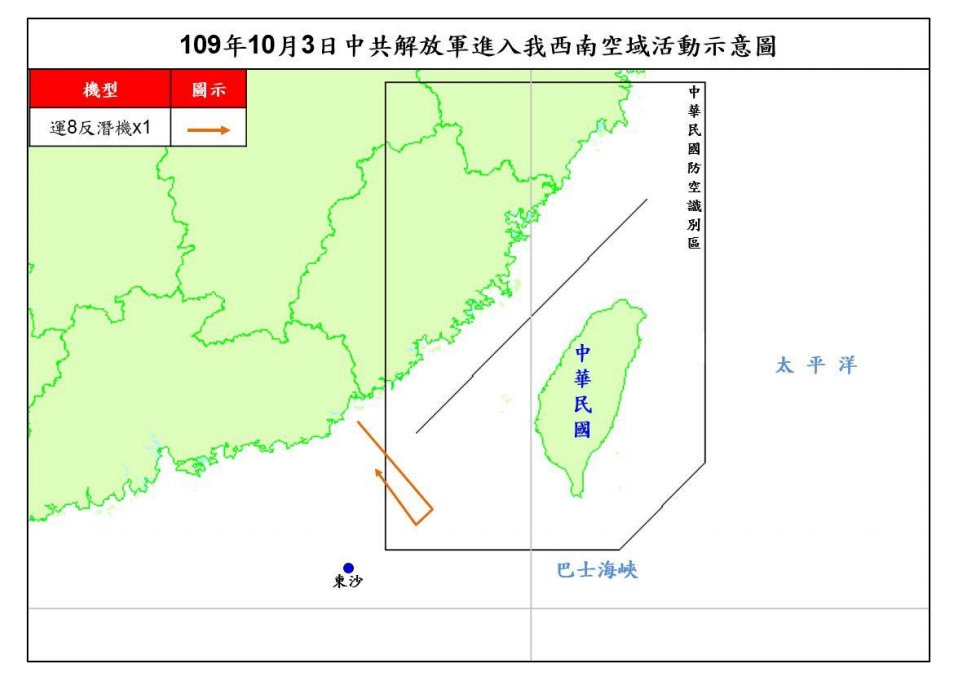 根據國防部10月公布的路線,共軍1架次運8反潛機1日侵犯台灣西南ADIZ。