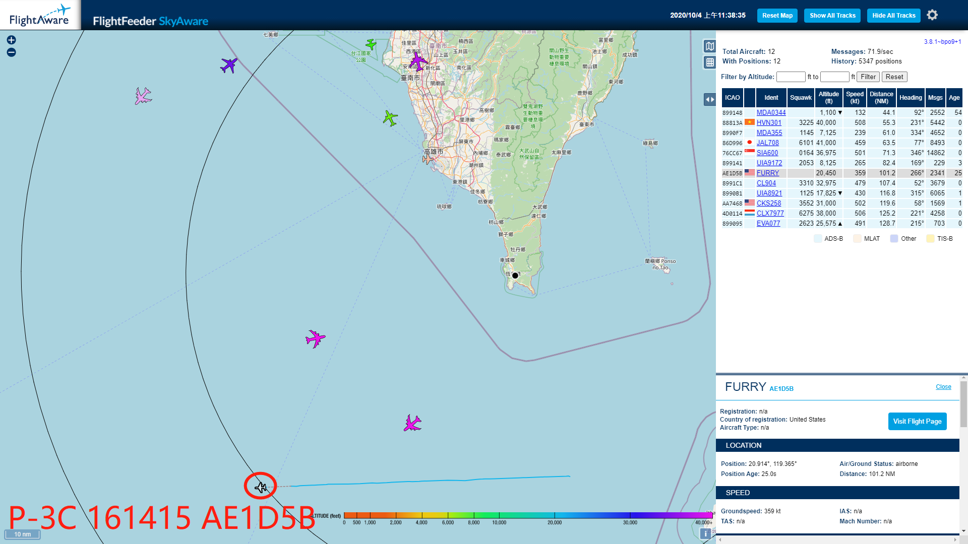 根據軍方統計,9月以來解放軍軍機已經超過50次進入台灣周遭海域。臉書粉專台灣西南空域今天貼出一張即時觀測航跡圖,表示除了共機外,「美國海軍 P-3C #AE1D5B #161415 通過巴士海峽進入南海,會不會北上進入我西南空域和共機各自獵鯊?」台灣西南空域粉專對於中美反潛機同時出現在同一空域,感到相當好奇,不禁疑惑發問「有美艦要北上通過台海嗎?」