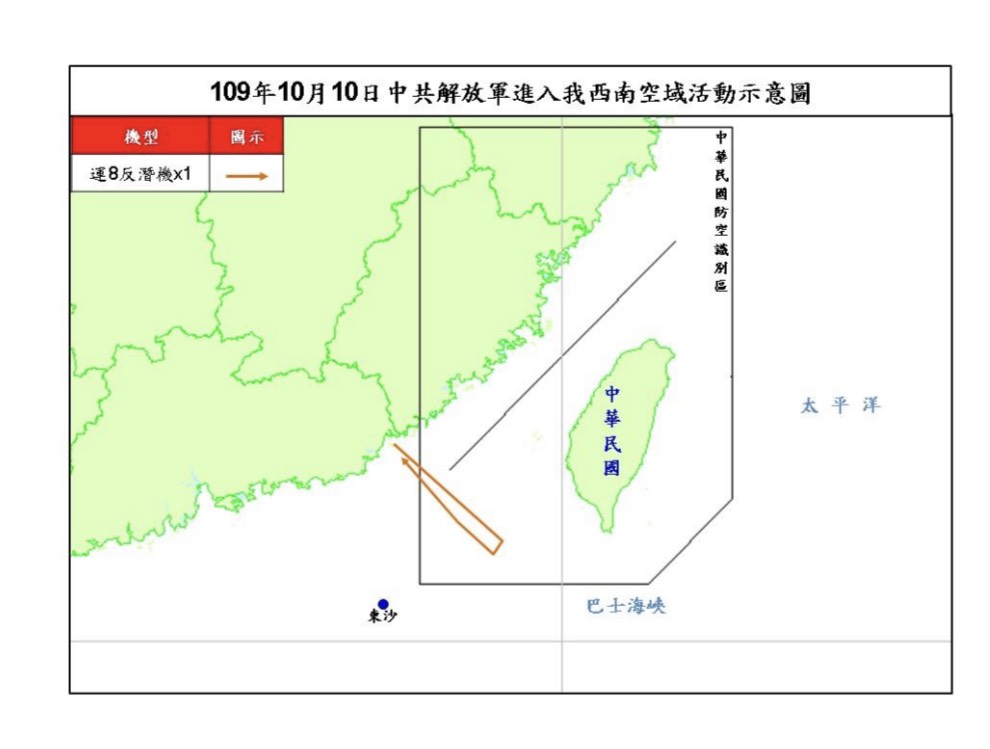 依照軍方近期的資料顯示,共機在9月16日至10月9日有56架次擾台,依序為9月16日,運8反潛機2架次;18日2架轟六、8架殲16、4架殲11與4架殲10;19日有12架殲16、2架殲10、2架殲11、2架轟六,以及1架運8反潛機;21日運8反潛機2架次;22日運8反潛機2架次;23日運8反潛機2架次;24日運8反潛機1架次;29日運8反潛機2架次。此外,10月1日運8反潛機1架次;10月3日運8反潛機1架次;10月4日運8反潛機1架次;10月6日運8反潛機1架次;10月7日空警500機1架次;10月8日運8反潛機1架次;10月9日1架運8反潛機、1架運9反潛機。