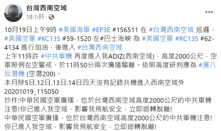 共機在10月份已經連續侵擾我國空域,截至昨日為止,空軍至少53次廣播驅離共機,此外,臉書粉專「台灣西南空域」也透露,10月除了5日、12日、13日和14日四天,沒有記錄共機進入西南空域外,其餘天數幾乎都有共機擾台的紀錄,廣播內容不外乎都是「中華民國空軍廣播,位於台灣西南空域的中共軍機注意,你已進入我空域,影響飛航安全,立即迴轉脫離。」