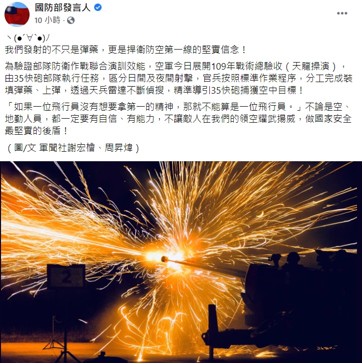 國防部還補充,為驗證部隊防衛作戰聯合演訓效能,空軍19日已展開109年戰術總驗收(天龍操演),由35快砲部隊執行任務,區分日間及夜間射擊,官兵按照標準作業程序,分工完成裝填彈藥、上彈,透過天兵雷達不斷偵搜,精準導引35快砲捕獲空中目標。「如果一位飛行員沒有想要拿第一的精神,那就不能算是一位飛行員。」不論是空、地勤人員,都一定要有自信、有能力,不讓敵人在我們的領空耀武揚威,做國家安全最堅實的後盾。