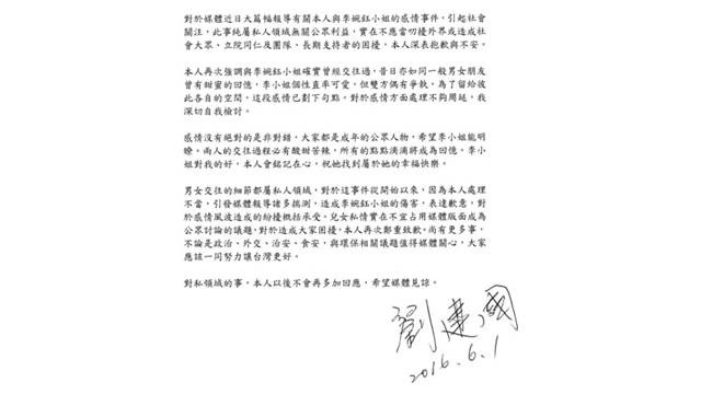 男女交往的細節都屬私人領域,對於這事件從開始以來,因為本人處理不當,引發媒體報導諸多揣測,造成李婉鈺小姐的傷害,表達歉意,對於感情風波造成的紛擾概括承受。兒女私情實在不宜占用媒體版面成為公眾討論的議題,對於造成大家困擾,本人再次鄭重致歉。尚有更多事,不論是政治、外交、治安、食安,與環保相關議題值得媒體關心,大家應該一同努力讓台灣更好。
