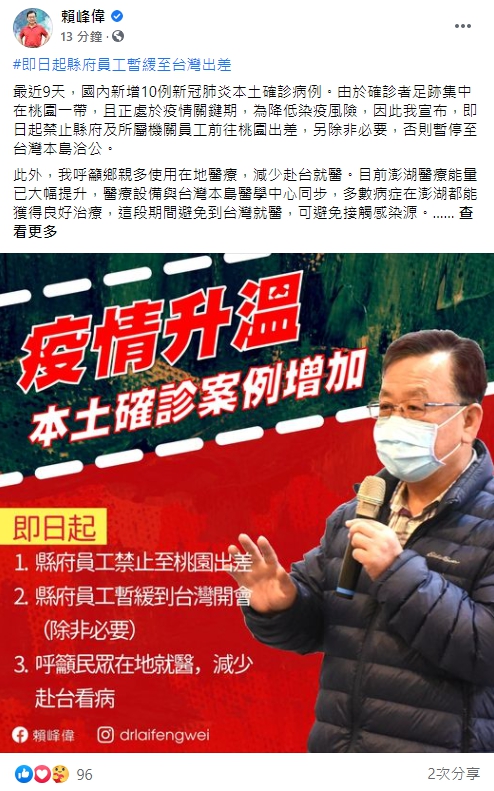▼澎湖縣長賴峰偉發文,禁止縣府人員到桃園出差。(圖/翻攝自賴峰偉臉書)