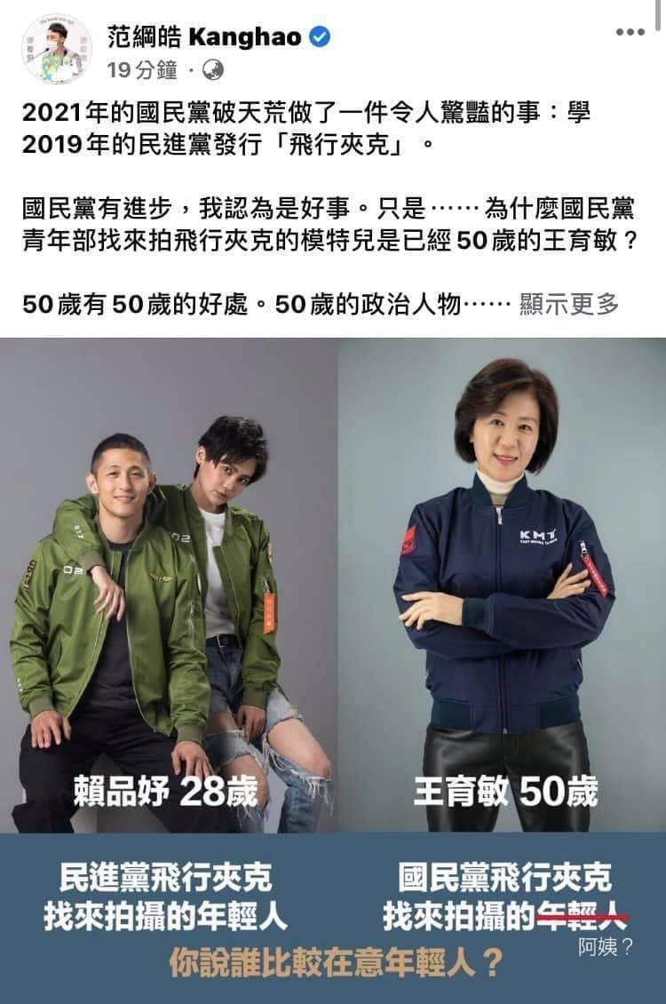 范綱皓指出,國民黨學民進黨發行飛行外套,但民進黨找的是28歲的「年輕人」賴品妤拍攝照片,國民黨卻找來50歲的「阿姨」王育敏,「你說誰比較在意年輕人?」