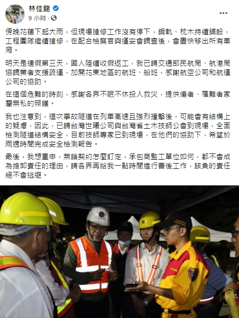 台鐵太魯閣號出軌意外造成51人罹難,交通部長林佳龍煎熬近48小時,傳出已向總統府口頭請辭。林佳龍於昨(3)日晚上在臉書貼文重申,無論契約怎麼訂定,承包商監工單位如何,都不會成為推卸責任的理由,「請各界再給我一點時間進行善後工作,該負的責任絕不會逃避」,根據平面媒體傳出,他已經向總統府提出口頭請辭,表達會負責,但林佳龍本人尚未回應,團隊也未證實。