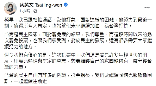 稍早蔡英文在臉書透露已和陳柏惟通過電話,替他打氣,「面對這樣的困難,他努力到最後一刻,值得所有人肯定,也希望他未來繼續加油,為台灣打拚。」她也表示尊重罷免案的結果,而這段時間以來的幾次罷免投票,也讓我們感受到,對於民主的發展,還有很多需要大家繼續努力的地方,「但令我們有信心的是,這次投票中,我們還是看見許多年輕世代的朋友,用無比熱情與堅定的意志,想要維護自己的家園能夠有一席守護台灣的力量。」