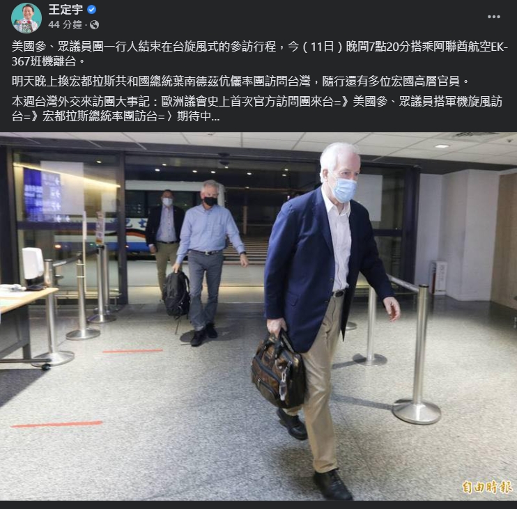 ▼王定宇在臉書發文指出,葉南德茲12日晚間抵台。(圖/翻攝自王定宇臉書)