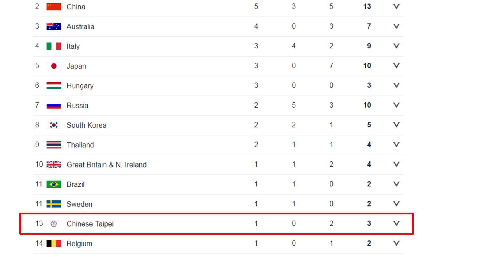 圖片中可以看到,《CNN》網站的「獎牌榜」中所顯示的圖示是台灣「國旗」,而非「五環梅花會旗」,只不過國家縮寫不是TW或ROC,而是TPE(台北)。其他國外媒體例如BBC等,都是使用五環梅花旗,只有CNN用我國國旗,因此受到不少網友關注。