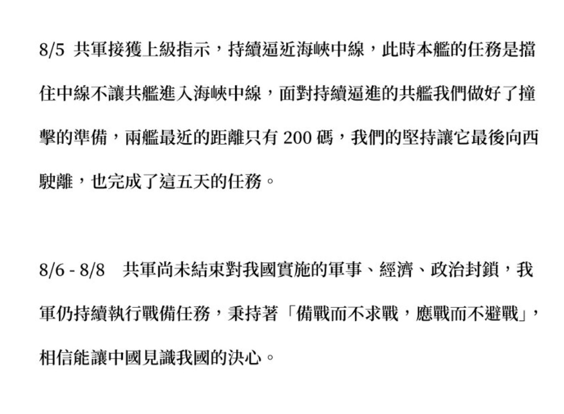 美國眾議院議長裴洛西(Nancy Pelosi)訪台,中國大陸為表達不滿,自4日起開始在台灣周圍大規模舉行軍演;對此,有民船5日拍攝到國軍成功級巡防艦,共軍052C舷號150長春艦對峙畫面,引發外界討論,其中當時在成功艦上的官兵日誌內容曝光,詳細講述了兩艦對峙時所發生的情形。