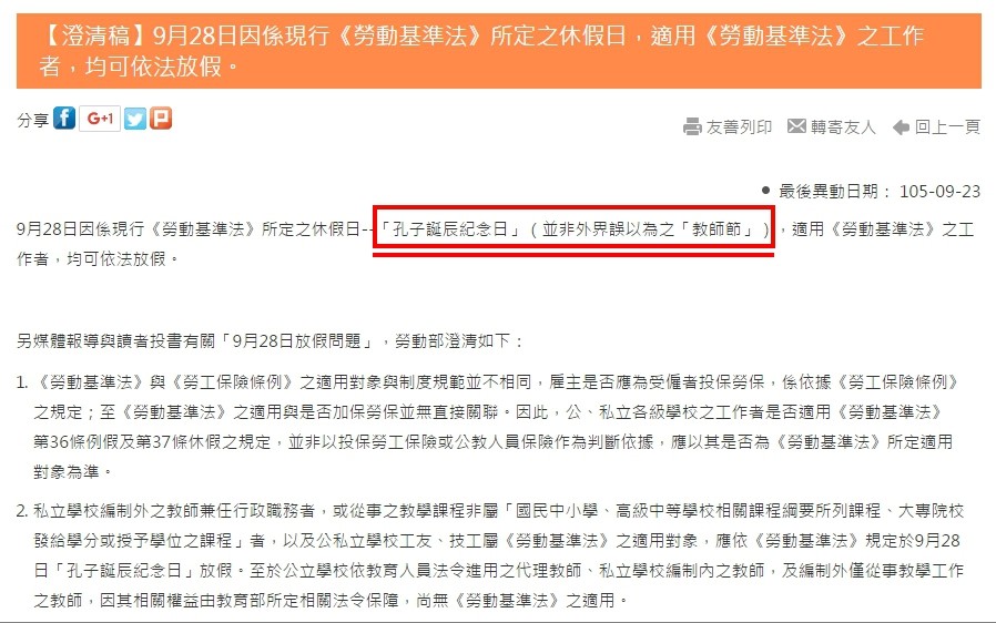 勞動部官網就貼出了一篇「神解釋」,九二八勞工放的是勞基法所定「孔子誕辰紀念日」,而不是外界誤以為的教師節,所以勞工依法可以放假。