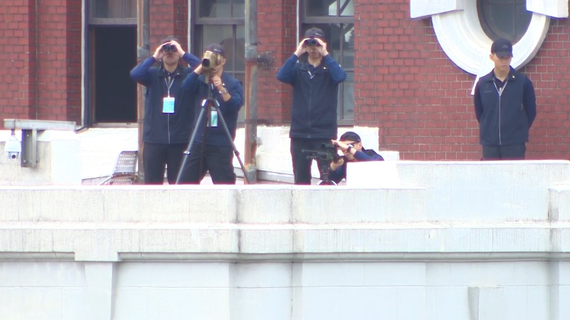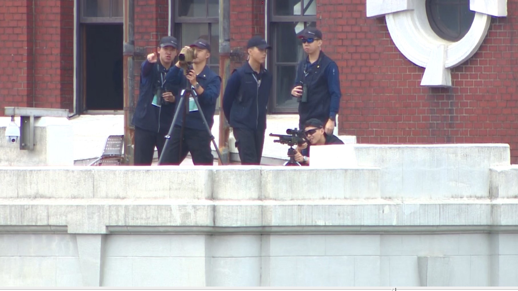 國慶大會今日上午登場,維安方面,大批人員已至各衛哨點站崗,現場可以看到狙擊手部署在總統府頂樓,架起狙擊槍戒備,從高處瞰會場以掌握全區動態。