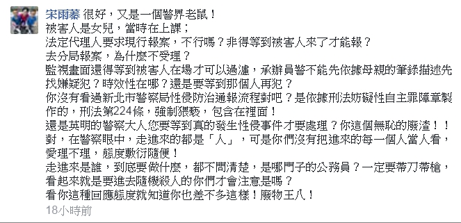 而在昨天下午,宋雨蓁將這段質詢的片段放上自己的臉書,寫下「基層員警辦案缺乏積極主動,藐視民眾權益,積習已久,難以原諒!」,有許多網友都上前留言表達看法,其中有一名員警留言「請問被害人是誰?媽媽還是女兒?誰能做筆錄?誰有做筆錄的權利?性侵害跟性騷擾是一樣的嗎?在警察面前你走進來就是一個人啊,危機意識難道您對警察有威脅性?」