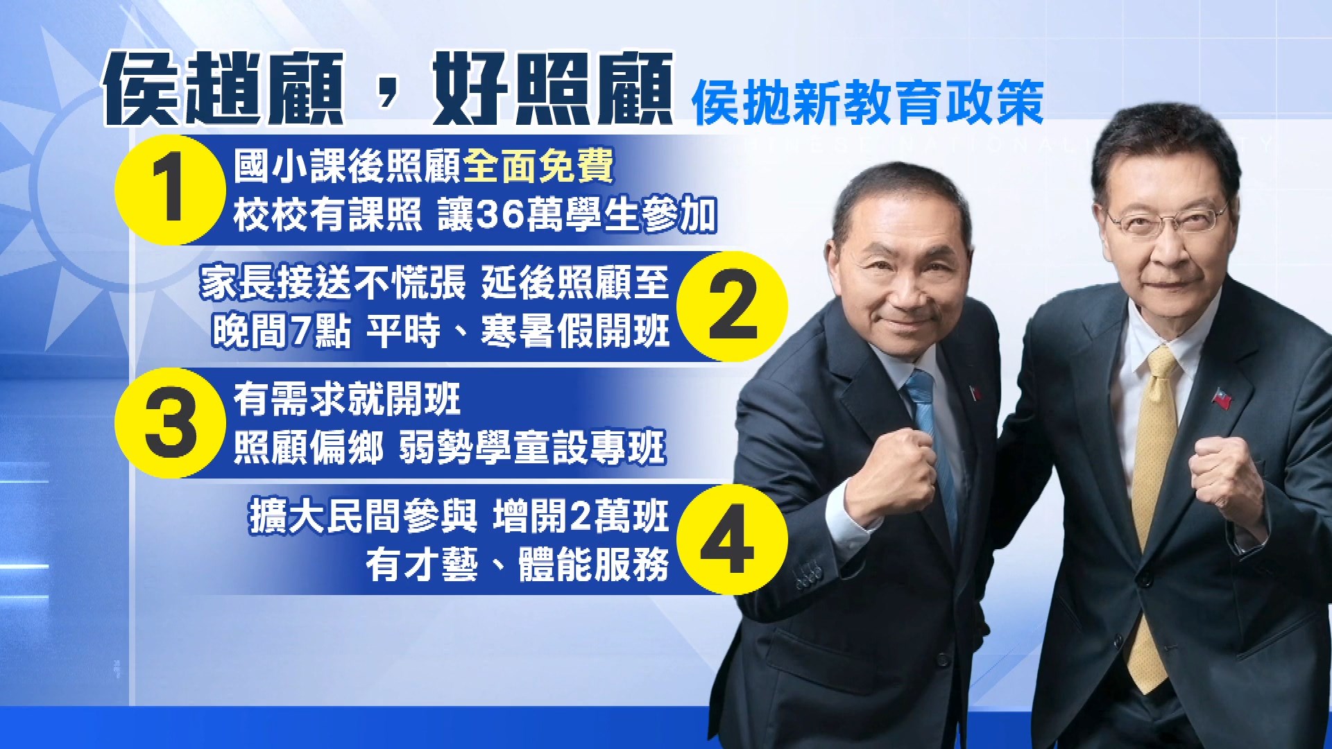 國民黨總統候選人侯友宜:「公立國小的課後照顧,全面免費,而且要達到人數倍增,我希望我的開辦率,從現階段的72%,可以達到100%。」