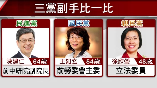 率先上場的王如玄,就跟攀岩一樣,一步接一步慢慢往上爬,週一才要開始做準備,靠天生口才一周應該足夠。翻開三人資歷,曾任中研院副院長的陳建仁年紀最長,其次王如玄,律師出身曾任勞委會主委,辯才無礙,三人中年紀最小的是搭配親民黨出征的徐欣瑩,立委出身,共通點三人都是大選辯論新手。親民黨副總統候選人徐欣瑩:「這次呢是很深入的了解,可能會提問的問題,還有我們要向全國的民眾來表達我們的理念。」