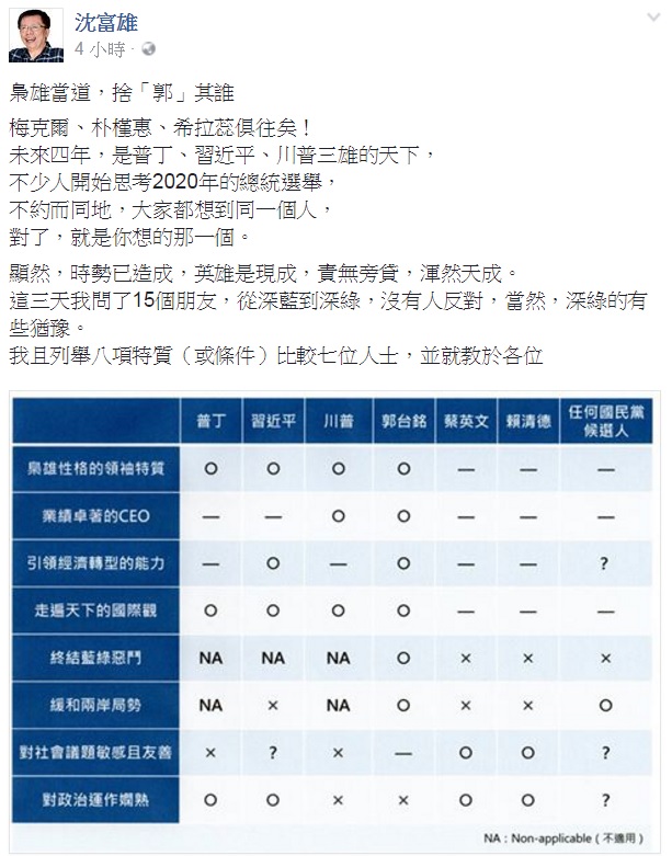 沈富雄分析,未來4年會是強人當道,「普丁、習近平、川普」三雄天下。而台灣「不約而同地,大家都想到同一個人,對了,就是你想的那一個」。沈富雄認為「英雄是現成的,責無旁貸,渾然天成」,並且說自己已經問了15個朋友,從深藍到深綠沒有人反對,「當然深綠的有些猶豫」。