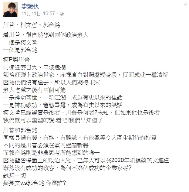 資深媒體人李艷秋日前也指出,川普和郭台銘同樣具備有錢、有能、有膽識、有俠氣等令人產生期待的特質,但不同的是川普必須在黨內過關斬將,而藍營檯面上的政治人物,已經沒有人可以在2020年阻擋蔡英文連任。李艷秋認為,郭台銘則是目前所能想到的唯一,國民黨為何不派郭台銘出來選?