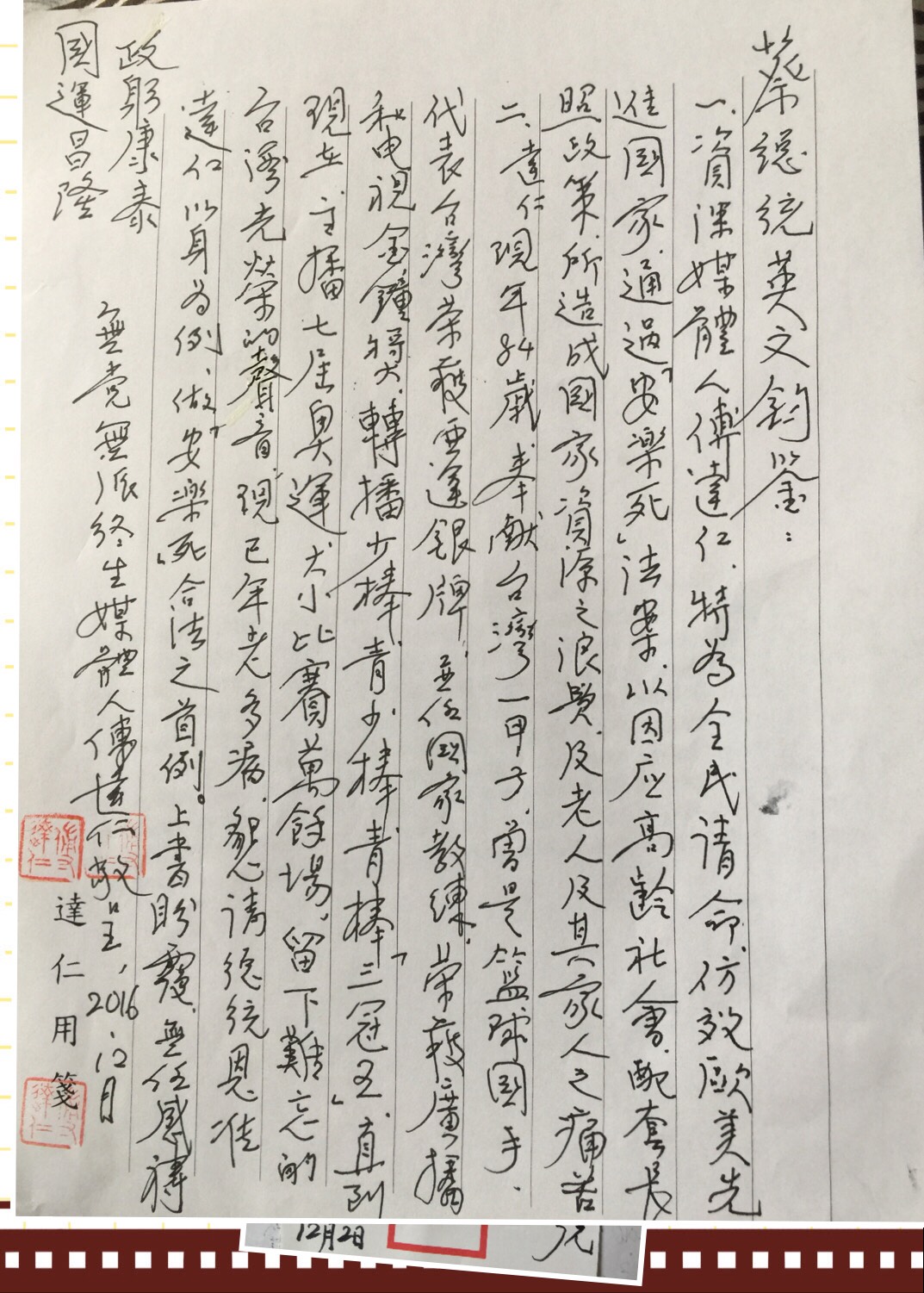 一、 資深媒體人傳達仁特為全民請命,仿效歐美先進國家,通過「安樂死」法案,以因應高齡社會配套長照政策所造成國家資源之浪費,及老人及其家人之痛苦。