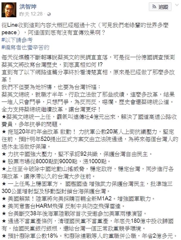 台北市政府前市政顧問洪智坤,在個人臉書po文表示,「德國調查預測蔡英文將改寫台灣歷史,到底真相如何!?」,他貼出自己在Line收到超過10次的蔡英文政績列表,希望大家能「看清楚真相」,原來蔡政府「已經做了那麼多改革!」,洪智坤po出的文章中,細數「國道高速公路收費員抗爭」、「預計廢除軍公教18%」、「行政院控告太陽花不起訴」、「百億『潛艦國造』」、「廢除國民黨小金庫」等83項改革。