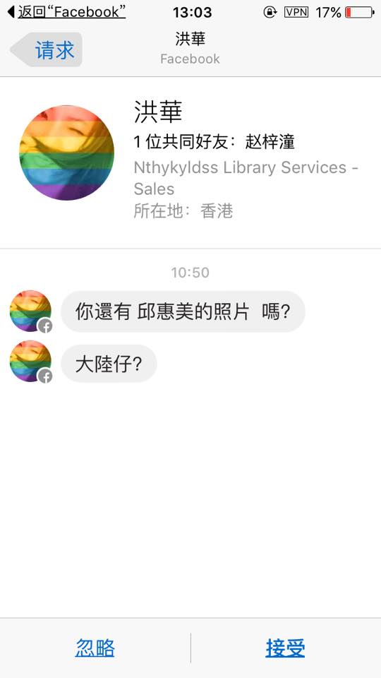 童仲彥之後在臉書公開該男身分並嗆:「我已找到你了,請小心請自重。」而這位被掀出來的上海「愛大神」男子,昨天(1)突然在臉書上,PO出一張訊息截圖,疑似為網友私訊質問上海男與邱女的關係,並問道「你還有邱●●的照片嗎?」「大陸仔?」,用語顯然並不友善,上海男「愛大神」將截圖貼出後,同時PO文說道:「這位兄弟說話注意言辭。謝謝!」