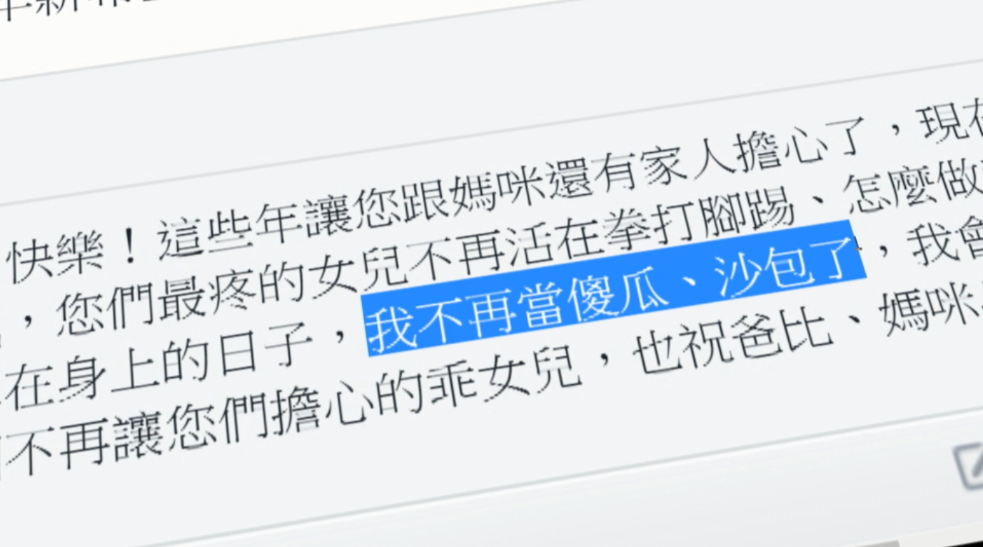 「 爸比:生日快樂!這些年讓您跟媽咪還有家人擔心了,現在您們終於可以鬆一口氣,您們最疼的女兒不再活在拳打腳踢、怎麼做都錯、綁一個不定時炸彈在身上的日子,我不再當傻瓜、沙包了,我會好好照顧我自己,當一個不再讓您們擔心的乖女兒,也祝爸比、媽咪身體健康!」