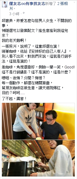 臉書分享2張照片,一張是邱惠美端著咖啡,送給自己安排好的客人,另一張則是邱惠美煮咖啡的照片,羅友志還酸說「角度還喬好,側臉一顰一笑,Good!」,更痛批「這不是行銷攝影?這不是演的,這是什麼?」別人可能看不出來,但是對我們來說,「這就是行銷手法,這就是演的!」