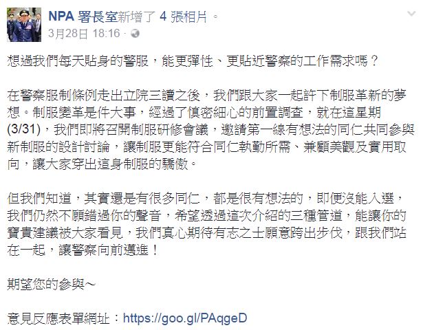 歷經近30年的等待,去年4月《警察服制條例修正案》在立法院三讀通過,制服的設計權回到內政部手中,所以警政署成立專案小組啟動改革計畫,目前也透過警政署《NPA署長室》臉書,表示邀請所有員警一起討論,說出工作上的需求,來共同設計最適合外勤的警察制服。