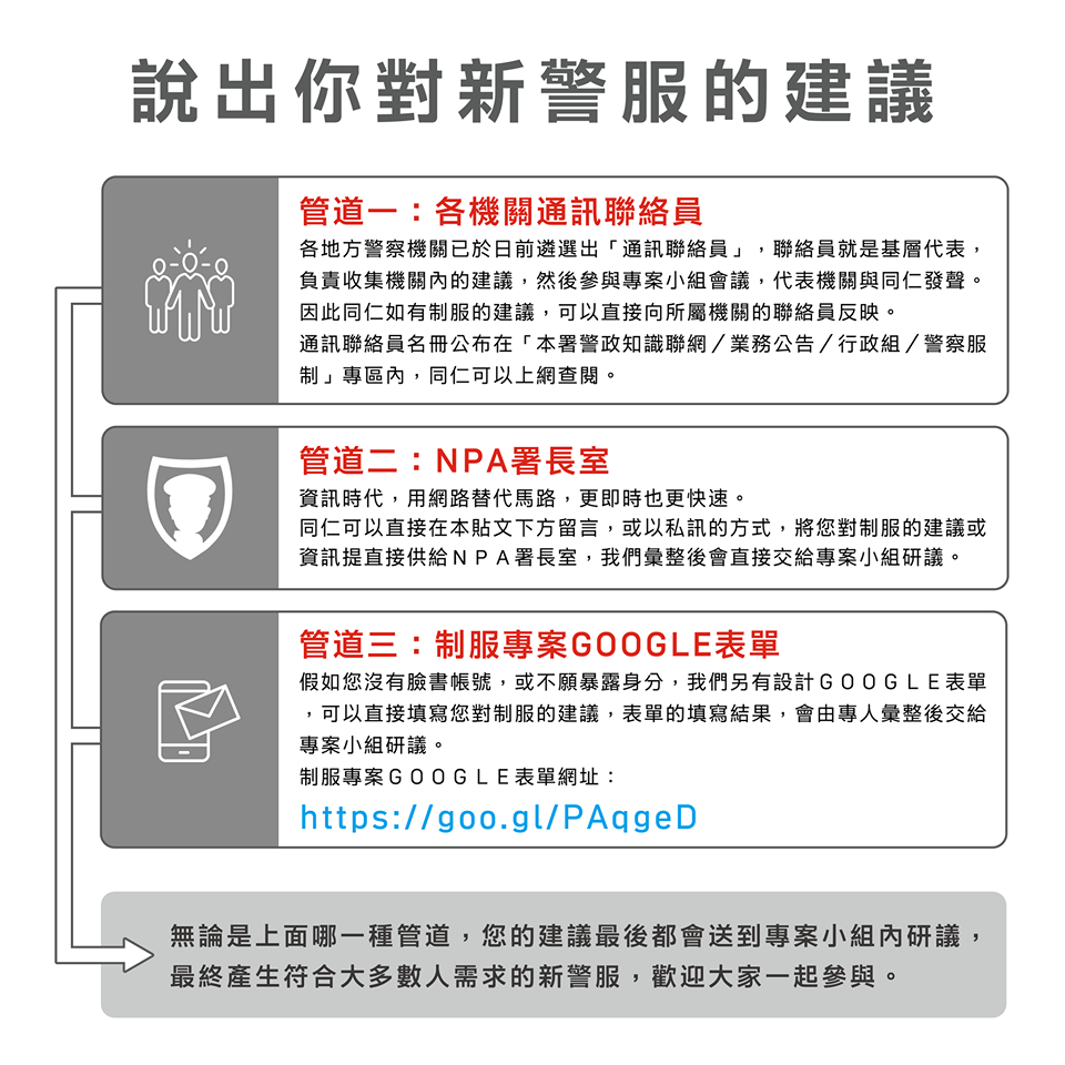 警政署提供三種管道,第一種是由各地警察機關的「通訊聯絡員」收集意見,然後代表參與專案會議,為同仁發聲;第二是警察可以在《NPA署長室》臉書的貼文下留言、私訊;第三種是填寫Google表單,讓專案小組進行研議。