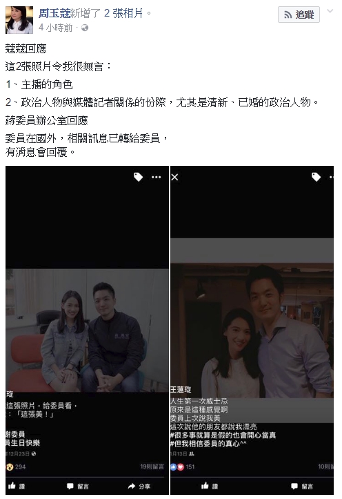 周玉蔻今(8日)早在臉書上PO出兩張國民黨立委蔣萬安及民視女主播王薀琁的