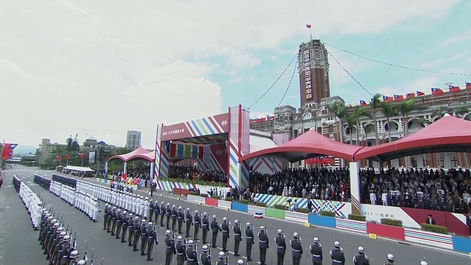106年國慶大會今(10)日在總統府前盛大展開,總統蔡英文發表國慶演說,將主題鎖定在「更好的台灣」,以衝刺改革、兩岸關係、國際位置三面向為脈絡,表示台灣因為團結變得更好、更偉大,整段演說提及6次中華民國,48次台灣。